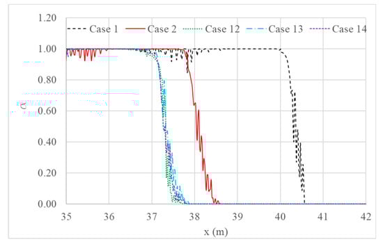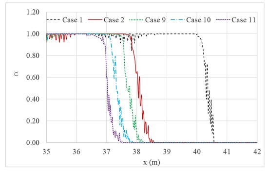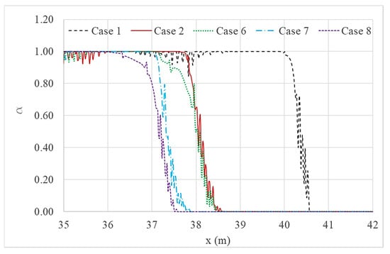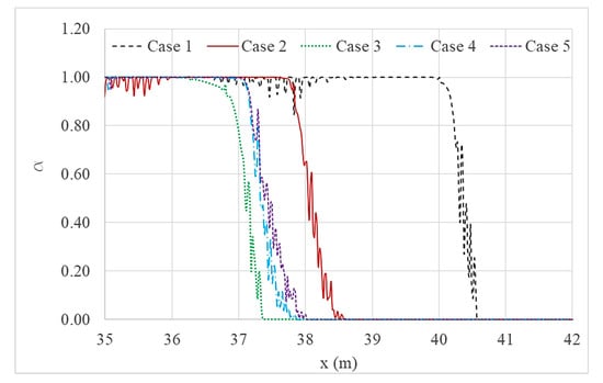 Next stage of the investigation was to assess the inundation that had occurred by the striking wave at the 1:100 beach slope for each simulation case. Wave induced inundations for a given time (240 s of simulation time) were plotted and presented in Figure 17, Figure 18, Figure 19, Figure 20 and Figure 21. The y-axis of these figures is scaled to, which is a dimensionless fraction delaminating air and water used in the simulations. Water is represented when and air is represented when . Therefore, the interface between 1 and 0 at the beach slope can be identified as the point at where the water wave is reached on the 1/100 beach slope at a given time. values between 0 and 1 indicates the air-water mixture at the fluid transition interface.