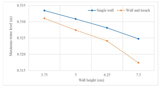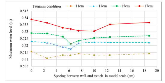 Similar to Figure 11, Figure 13 shows a reduction of the maximum water level variation after applying structures onshore. The wall and trench system with the widest wall suppressed the upcoming wave better than other structure combinations. All the other wall and trench systems also reduced the free surface variation better than that of a single seawall system.