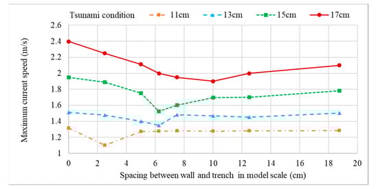Figure 23 and Figure 24 show the impact of spacing between the wall and the trench of the structure system onshore in regard to water level and current velocity reduction. When a tsunami with a comparatively low wave height (0.11 m case) strikes, the overtopping wave front does not travel too far before it collapses to the lee side of the wall. Thus, 0.05 m spacing between the wall and the trench is enough to capture the collapsing wave. When the wave height of the tsunami increases, the travelling distance of the overtopping wave front is also increased and therefore, the spacing between the wall and the trench should also be increased to capture the collapsing wave to generate more turbulence to depress the wave energy.