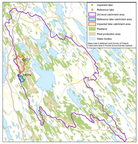 A total of 62 lakes (32 impacted, 30 reference) were initially selected from central Finland (Figure 1). Medium- to small-sized lakes (5–40, <5 ha) were first randomly selected using a GIS-based approach and publicly available spatial data from National Land Survey (NLS) (base map data, including lakes and peat extraction areas [13]) and the Finnish Environment Institute (catchment boundary data [14]). The selected lakes was then narrowed down by verifying the existence/nonexistence of peat extraction areas near the sites, resulting in 32 potentially impacted lakes (Figure 1). The potential drainage pathway from the peat extraction site to the study lake was verified from the Environmental Impact Assessment documents of each peat extraction area [15]. These documents also stated that peat extraction in most studied lake basins started in the 1980s (1973–2005) and have been active since. Subsequently, reference lakes without peat extraction in their watersheds were selected adjacent to the potentially impacted lakes with the help of generalized catchment boundary data. Preference was given to lakes located in the same 3rd level catchment area or that were located nearby. This was done to ensure that the impacted and the reference lakes had comparable land-use histories and were characterized by similar climatic, geomorphological, and geological environments.