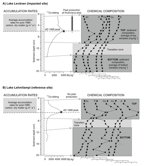 The accumulation rates were studied from the post-1986 sediment sections of the cores (left panel), whereas the top–bottom sediment sections were defined independently of the dating results based on the changes in element composition alone (right panel). (A,B) presents examples for impacted lake ((A), Lake Levänen) and reference lake ((B), Lake Lehmilampi).