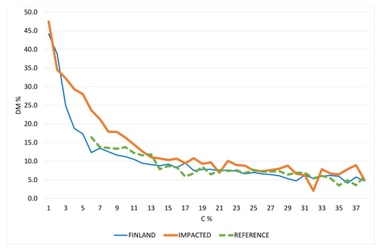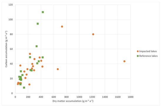 The dry matter to carbon (DM/C) ratio for all samples/cores of the studied lake sediments was in general similar to other small lakes in Finland (Figure 6) (e.g., [20]). The only noticeable difference can be found in those impacted lakes that have carbon contents less than c. 10%. They are also characterized by higher dry matter contents than typical small lakes in Finland (Figure 6). Figure 7 shows the post-1986 carbon and dry matter accumulation rates in the impacted and reference lake groups. In most cases, both groups have carbon accumulation rates between 10 and 60 g m−2 a−1 and DM accumulation of less than 500 g m−2 a−1. There are no significant differences between the lake groups. The highest scattered values of DM accumulation rates (up to 1700 g m−2 a−1) can be found in the impacted lake group, while the highest carbon accumulation rates are in the reference group lakes and reach up to 115 g m−2 a−1.