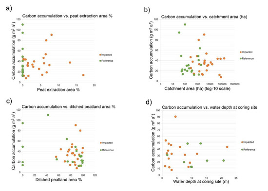 Carbon accumulation rates for the post-1986 period (g m−2 a−1) compared to four environmental variables, with (a) peat extraction area (%), (b) catchment area (ha), (c) ditched peatland area (%), and (d) water depth at coring site.