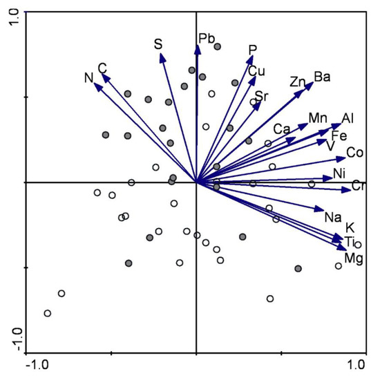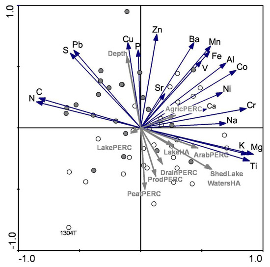 PCA ordination of the chemical composition of the upper most (top) sediments of the cores is shown in Figure 11. These upper core sediments were impacted by global change and modern land use, including peat extraction. Changes in the plot from the predisturbance state are fairly small within peat-extraction impacted lakes (dark grey dots); the sediment samples are concentrated more to the lower right quadrant, which is indicative of sediments with high mineral contents (high Ti, K, Mg, Na, Cr). Similarly, the reference lakes (light grey dots) mostly plot in the upper left quadrant where the sediments are enriched in carbon, nitrogen, and related elements. Here again, the environmental variables correlated with PCA Axis 1 variables and are related to mineral-rich sediments, including the size of the watershed (0.58) and the watershed to lake size ratio (a water residence time surrogate variable, 0.55). Water depth at the coring site had the highest correlation with PCA Axis 2 (0.58), followed by the percentage of peatlands in the watershed (−0.51) and peat extraction percentage (−0.45). Large watersheds in the dataset were intensively drained and have a higher than average percentage of peatlands and peat extraction. In contrast, reference lakes have fewer peatlands (and by definition also less peat extraction) in their catchments than impacted lakes, but their sediments are organic-rich (Figure 12).