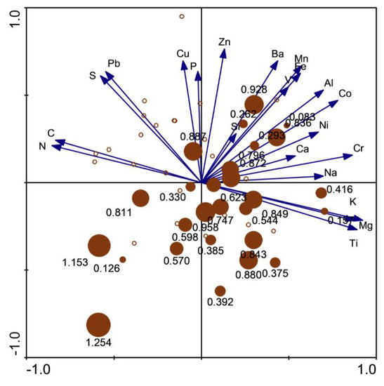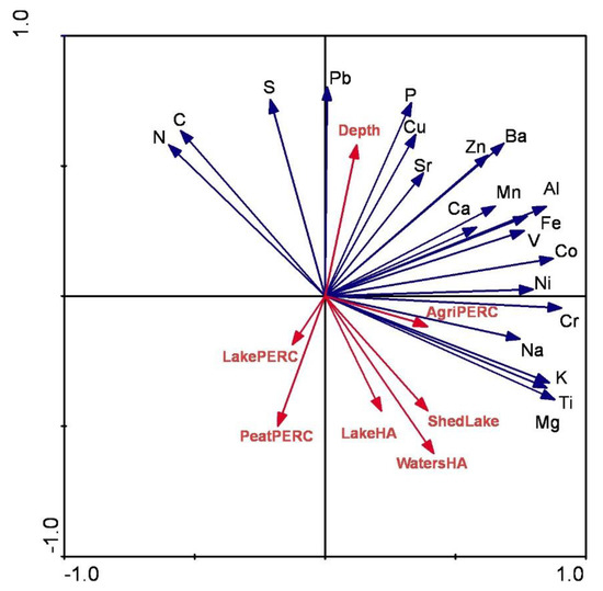 Figure 10 shows the environmental variables that describe the lake basin superimposed on the PCA plot of elemental concentrations in the bottom sediments. The highest correlations with both PCA Axis 1 (horizontal axis) and Axis 2 (vertical axis) were with the size of the catchment (0.42 and −0.60), a variable with high variation in the dataset. Axis 2 was further correlated with depth at the coring site (0.60), the share of peatlands in the catchment (Peatland%; −0.50), catchment to lake ratio (−0.48), and lake size (−0.42). The PCA ordinations thus indicate that bottom sediments from large lakes with large catchments are naturally enriched in mineral matter (K, Ti, Mg) (lower right quadrant). In addition, lakes with high concentrations of trace elements in their sediments are those with a lower than average percentage of peatlands and lake basins in their catchments (upper right quadrant). These lakes are also deep and currently have a higher-than-average percentage of agricultural land in their catchments. For the bottom sediments studied here, the latter variable translates to a high percentage of fine-grained soils suitable for agriculture (although some agriculture was probably present during the deposition of these bottom sediments).
