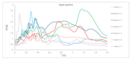 The fragility curve has been proposed as a well-established approach in earthquake engineering to consider uncertainties in demand and capacity. They represent graphical relationships between the conditional probability of exceeding predefined damage states (DS) for given levels of EDP (engineering demand parameters) and are used to estimate the amount of damage for a particular level of shaking defined with intensity measures (IM). For example, fragility curves, based on HAZUS-MH MR5: Technical Manual [43], consist of considering four states (slight, moderate, extensive, complete), and they display the probability that the response of a system exceeds a given threshold limit given a certain excitation level, as applied in Ranjbar, P.R.’s work [46]. Lateral spread displacements and settlement at the surface were chosen as EDPs to assess the seismic effects of liquefaction on FF and SSI systems and thus developing analytical fragility curves to define liquefaction-induced damage. Peak Ground Acceleration (PGA) is selected as the IM, scaled to multiple levels from zero to 1.0 g with steps of 0.1 g, following the well-credited approach of incremental dynamic analysis (IDA) proposed by Hwang, H.M. [49]. Thus, a number of 10 × 7 IDA nonlinear analyses were performed (with Opensees PL) for each case study (total 140). The input motions (Figure 1 and Table 1) were selected from the Pacific Earthquake Engineering Research (PEER) Center Next generation Attenuation (NGA) database (http://peer.berkeley.edu/nga/), ([53,54] on the base of Eurocode prescriptions) to significantly affect the dynamic characteristics of the system and was applied at the base of the models, along the x-axis (longitudinal direction). In particular, IDA requires a series of nonlinear, dynamic time history analyses for the selected ensemble of ground motions with increasing intensity levels to cover the entire range of the response, from elastic behaviour through liquefaction condition. Therefore, the limit state was chosen as the liquefaction condition (ru = 1). Pore pressure ratio (ru), defined previously in [5], considers the pore pressure as a fraction of the vertical stress (including the weight of ponded water, if the material is submerged) [32]. This study assumes that all uncertainties in the fragility curves can be represented by lognormal distributions, and, thus, only two parameters were needed to plot the curves, the logarithmic mean (µ) and standard deviation (β) of the lognormal seismic intensity measure (PGA). In particular, there are several reasons that justify the use of lognormal distribution: (1) its simplicity in approximating an uncertainty quantity that must take on a positive value, using only an estimate of the central value and uncertainty, (2) the fact that it has been widely used for several decades in earthquake engineering and (3) it is the distribution that assumes the least knowledge (the only variables are the mean and logarithmic standard deviation). Therefore, IDA analysis results were represented to build linear regression and define the mean and log-standard deviation values. Moreover, the probability of liquefaction (ru = 1) for a specific intensity (PGA) was then calculated as