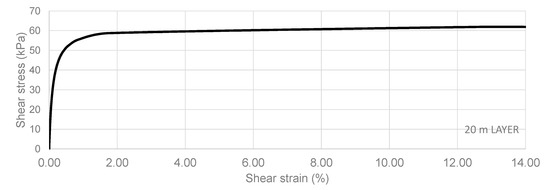 Step 1. A 3D numerical model was developed to build liquefaction potential curves in FF conditions. In particular, the soil performed in [33] was considered. The 3D soil models consisted of a 100 × 100 × 20 m mesh, performed with 8000 20-node BrickUP elements and 9163 nodes to simulate the dynamic response of solid-fluid fully coupled material [54,55]. Finite elements were defined on the wavelengths of the seismic signal and the maximum frequency above which the spectral content of the input was considered negligible (15 Hz). The dimension of the elements was increased from the structure to the lateral boundaries that were modelled to behave in pure shear and located far away from the structures, as previously applied in [32,33]. For each BrickUP element, 20 nodes described the solid translational degrees of freedom, while the eight nodes on the corners represented the fluid pressure 4 degrees-of-freedom (DOF). For each node, DOFs 1, 2 and 3, represent solid displacement (µ), and DOF 4 describes fluid pressure (p), which was recorded using OpenSees Node Recorder [55,56] at the corresponding integration points. The soil model applied the two-phase material µ -p formulation (where µ is the displacement of the soil skeleton and p is pore pressure) and simulated with PressureDependMultiYield02 (PDMY02) model [55,56], based on the multi-yield-surface plasticity framework and calibrated with centrifuge tests and consolidated undrained cyclic triaxial tests (VELACS No. 40–58), more details in [32,33]. Table 3 shows the adopted parameters, such as the low-strain shear modulus and friction angle, as well as parameters to control the contraction (c1), dilatancy (d1 and d2) and the level of liquefaction-induced yield strain (l1, l2 and l3), [55,56]. The backbone curve is shown in Figure 4. The penalty method was adopted for modelling the boundary conditions (tolerance: of 10−4), chosen as a compromise to be large enough to ensure strong constrain conditions but not too large to avoid problems associated with conditioning of the system of equations. Base boundaries (20 m depth) were considered rigid in all directions, and the input motions were applied at the base as acceleration time histories [32,33]. Vertical direction (described by the 3rd DOF) was constrained in correspondence with all the boundaries (at the base and lateral), while longitudinal and transversal directions were left unconstrained at lateral boundaries to allow shear deformations. The definition of the mesh dimensions followed the approach already adopted [32,33,53,54] and, to verify proper simulation of FF conditions at lateral boundaries, accelerations at the top of the meshes were compared with the FF ones, that were found to be identical, confirming the effective performance of the mesh.