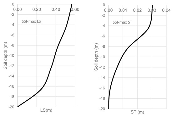 Soil–structure interaction (SSI): maximum lateral spread (LS) and settlement (ST) vs. soil depth (input motion 2, 100%).