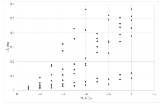 In this section, step 1 (FF conditions) is considered. 3D nonlinear dynamic analyses (total 70) were performed, and the maximum longitudinal displacements (named lateral spread, LS) and vertical displacements (named settlements, ST) were calculated for each. Figure 6 shows the results for input motion 2 (100%). For each analysis, the LS and ST at the surface in correspondence with the centre of the mesh were considered at with liquefaction condition (ru = 1) and defined on scaled PGA values (Figure 7 and Figure 8) to evaluate the variation of demand and capacity with ground motion characteristics. In particular, standard deviation (β) defines the dispersion about the mean value, and it significantly affects the slope of the curves. In particular, higher values of β increase the probabilities at low IMs and, at the same time, they decrease the probability at high IMs. The mean value (µ) defines the central tendency of the curves affecting the translation of them inside the range of values. Thus, bigger values of the mean correspond to a higher probability of reaching or exceeding a particular damage state. In particular, Table 8 shows the comparison between the values of β and µ that affect the difference between the two liquefaction-potential (LP) curves. LP probabilities at low PGA were bigger in correspondence with ST-FF (β = 0.624) than with LS-FF (β = 0.595). The mean values (µ) also were significantly different. Figure 9 shows the LP (liquefaction potential) curves for both the considered parameters (LS and ST), showing that both the curves represented a severe increase in the LP at a low value of PGA (low intensities). Comparing the two curves, it is worth noting that when lateral spread was considered, there was a significant difference of LP in the range of PGA = 0.20–0.30 g. For example, given an input PGA = 0.26 g, LP = 0.575 and 0.284 (around 50%), respectively, for ST-FF and LS-FF. If other levels of PGA were considered, this difference decreased significantly (at least to zero). In particular, the difference decreased gradually as the severity of the motion increased until around 0.80–0.90 g, where the curves were almost equivalent. For PGA values less than 0.20 g, referring to settlement was still more conservative than considering lateral spread. The reason for the difference is due to the fact that settlements are more sensitive to inertial forces connected with the vertical stresses (especially the weight) and start at a low value of PGA, while lateral spread needs a higher level of intensity to occur since they are connected with shear mechanisms.