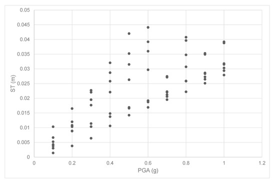 Step 2 is shown in this section, and the role of the structure is discussed by calculating LS and ST for the 70 3D nonlinear dynamic analyses. Figure 10 shows the results for input motion 2 (100%) to give an example of the soil behaviour. LS and ST were calculated at the surface in correspondence with the centre of the foundation that was demonstrated (see [47]) being mostly affected by the presence of the structure (mainly in terms of vertical stresses). LS and ST were considered in correspondence with liquefaction condition (ru = 1) and plotted in Figure 11 and Figure 12. Table 9 shows the comparison between the values of β and µ that affects the difference between the two LP curves. In particular, LP probabilities at low PGA were significantly bigger in correspondence with ST-SSI (β = 0.653) than with LS-SSI (β = 0.624). The mean values (µ) were significantly different. Figure 13 displays LP curves for both the considered parameters (LS and ST) showing that ST-SSI curve represented a severe increase in the LP at a low value of PGA (for earthquakes with low intensity). Comparing these two curves, it is worth noting that when lateral spread was considered, there was a significant difference of LP in the range of PGA = 0.10–0.25 g. For example, given an input PGA = 0.175 g, LP = 0.666 and 0.195 (around 30%), respectively, for ST-SSI and LS-SSI. If other levels of PGA were considered, this difference decreased significantly (at least to zero). In particular, the difference decreased gradually as the severity of the motion increased until around 0.70–0.90, where the curves were almost equivalent. These curves show the role of the structure in aggravating the vertical stresses (due to the structural weight). In particular, the low-rise structure was selected to consider the effect of a rigid and heavy superstructure on the inertial interaction between the structure and the soil that is herein demonstrated to be significantly detrimental in increasing LP values. These results confirm that the damage is mainly governed by the rigid rotations and settlements, and liquefaction works as a natural isolation system against the transmission of inertial seismic actions on the superstructure, as shown in [19].