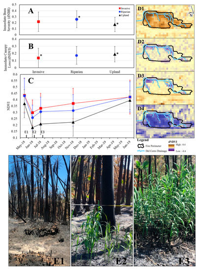 Temporal and spatial distribution of vegetation indices for the Del Cerro Fire. The 0-year dNBR, a proxy for burn severity (A), 0-year dNDVI, a proxy for canopy loss (B), and the change in canopy over (NDVI) for each vegetation class over one year (C); the * denotes statistically different. The 0-year dNDVI for May 2018 to June 2018 (D1), June 2018 to July 2018 (D2), July 2018 to November 2018 (D3), and November 2018 to June 2019 (D4) distribution of canopy loss between NDVI estimates (C). The Arundo donax regrowth in the riparian area of Alvarado Creek observed on June 8, 2018 (E1), June 29, 2018 (E2), and July 23, 2018 (E3).