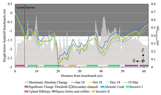 Four successive cross-sectional surveys looking downstream from June 2018 to March 2019 all normalized to the local benchmark as a datum. The maximum seasonal topographic change (∆HMaximum) at each point on the transect is shown on the secondary axis. The dark gray region represents a 75th percentile change in topographic height or greater. The transition from upland and riparian zones is denoted by the vertical black line, and secondary channels and Alvarado Creek are denoted by white and blue portions of the transect, respectively.