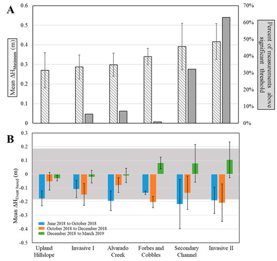 The highest mean ∆HMaximum occurred in the secondary channels (no vegetation present; 0.39 ± 0.12 m) and the Invasive II over-banks (0.42 ± 0.09 m), which were not statistically different (Figure 5A; primary axis). The Upland hill slope, Invasive I, and Alvarado Creek cover classes had the lowest mean ∆HMaximum of all the covers throughout the whole wet season. The Gravel and Forbes cover class had a statistically higher mean ∆HMaximum than the aforementioned three cover classes (0.34 ± 0.04 m). Although the secondary channels and Invasive II cover average ∆HMaximum were not statistically different, the Invasive II cover class had 31% higher seasonal maximum topographic changes that were above the 75th percentile threshold than the secondary channels (32%; Figure 5A; secondary axis). All other cover classes experienced some topographic change equal to or above the 75th percentile, except for the Upland hillslope.