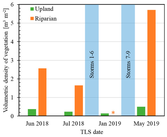 The volumetric density of vegetation per square meter in both the upland and riparian areas during four scans: June 29, 2018, July 23, 2018, January 19, 2019, and May 24, 2019. The June 2018 and July 2018 scans represent vegetation volumetric density before any storm events. The January 2019 scan represents vegetation after Storms 1–6. The riparian area (*) did not have sufficient scan point density in January 2019. The May 2019 scan represents the vegetation volumetric density approximately one-year post-fire.