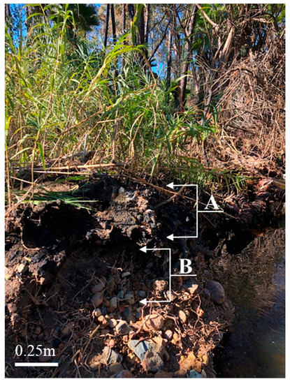 Undercutting of an Arundo donax stand on the south bank of Alvarado Creek on March 2019. Shallow Arundo donax root structure or rhizome (A) and undercut area with exposed palm roots imbedded in the structure of the streambank wall (B).