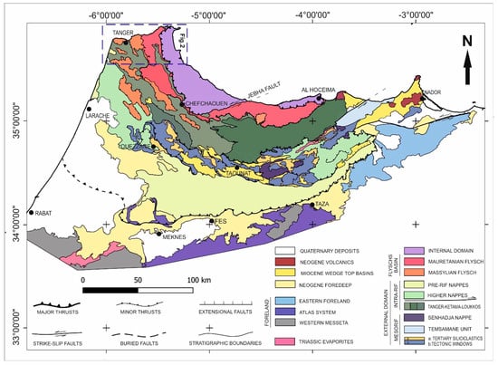 - Suter, G. Carte Géologique de la Chaîne Rifaine 1:500,000; Service géologique du Maroc, BRGM: Orléans, France, 1980. [Google Scholar]