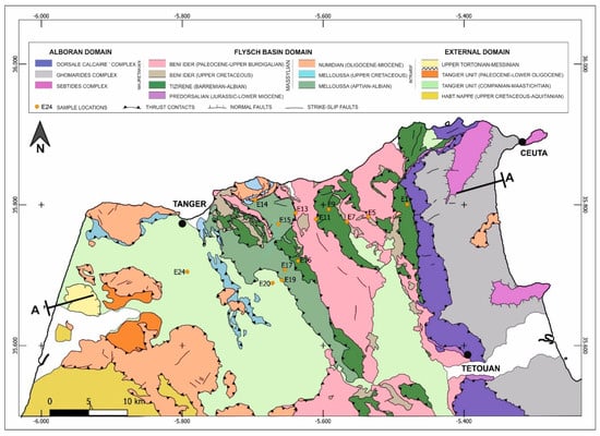 Geological map of the northwestern corner of the Rif belt with sample locations, compiled from the Geological maps of the Rif at 1/50000 published by the Geological Survey of Morocco [,,,,]. A-A’ refers to the studied transect (see Figure 4).
