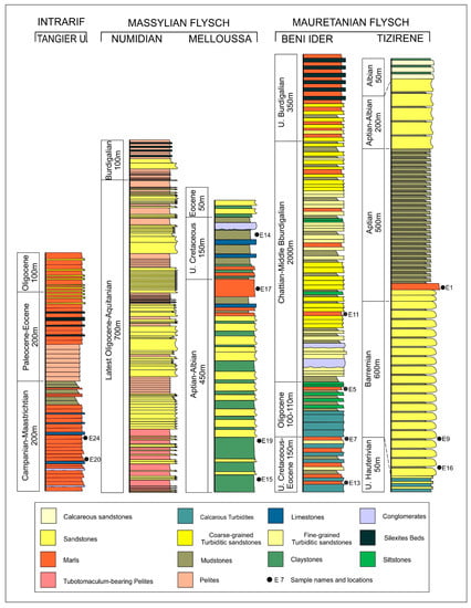 The Maghrebian flysch basin [,,] corresponds to the Meso-Cenozoic deep marine southern branch of the Maghrebian Tethys, which was connecting the Alpine oceans with the central Atlantic from the Jurassic up to the Miocene [,,,]. The Maghrebian flysch basin is subdivided into internal Mauretanian and external Massylian Domains (Figure 3, [,,]).