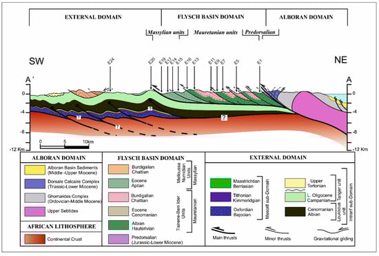 Structural cross-section (see Figure 2 for location) showing the overall architecture of the Maghrebian flysch basin and its relationship with the Internal and External domains based on [,,,,] and on field observations. Sample names and position are indicated.