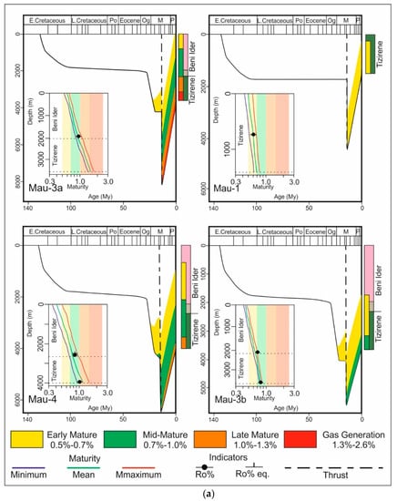 In the Maghrebian flysch basin (Figure 1 and Figure 2), the evolution of the Mauretanian succession started in Lower-Cretaceous times with the deposition of the Tizirene turbiditic flysch (Figure 3), and continues up to the Late-Burdigalian with the deposition of the Beni Ider siliciclastic sediments, which become gradually thicker toward the external portion of the Mauretanian basin []. During the Alpine orogeny, between the Late Burdigalian and Early Langhian, the Mauretanian and Massylian flysch were involved in the advancing of the orogenic wedge [,]. The compressive event affecting the Maghrebian flysch was expressed by four NE-SW thrusts sheets. Thermal models performed for the Mauretanian flysch basin show an increase of overburden moving from the most internal thrust sheet to the most external one (Figure 5a), varying from 3.1 km in the more internal thrust (Mau-1), located immediately at the footwall of the ‘Dorsale Calcaire’, to 4.2 km in Mau-4 (Figure 4 and Figure 6).