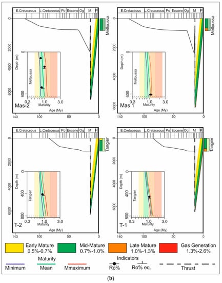 (a) Burial and thermal models of the Mauretanian thrust sheets showing maturity versus depth and hydrocarbon generations. Diagrams constrained by vitrinite reflectance Ro% and Ro% equivalent (calculated from Raman parameters). For detailed lithology, see Figure 3. Mau-(1, 3.a., 3. b., and 4): pseudo-wells belonging to each thrust sheet. Po—Paleocene, Og—Oligocene, M—Miocene, and P—Pliocene; (b). Burial and thermal models of the Massylian thrust sheets and Tangier unit showing maturity versus depth and hydrocarbon generations. Diagrams constrained by vitrinite reflectance Ro% and Ro% equivalent (calculated from Raman parameters). For detailed lithology, see Figure 3. Mas-1 and Mas-2: pseudo-wells belonging to the Massylian thrust sheets; T-1and T-2: pseudo-wells belonging to Tangier unit. Po—Paleocene, Og—Oligocene, M—Miocene, and P—Pliocene.