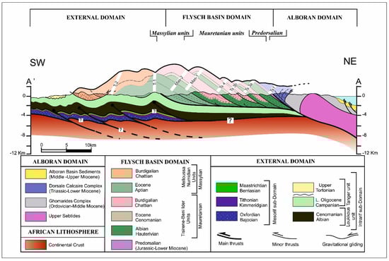 The transition between the two sub-domains is differentiated in the Oligocene-Lower Miocene sediments, where the Mauretanian Beni Ider turbidites evolve laterally to the Massylian Numidian sandstones through mixed successions [,,]. During the orogenesis, the sedimentary cover of the Maghrebian flysch basin formed a series of thrust sheets (Figure 4) [,].