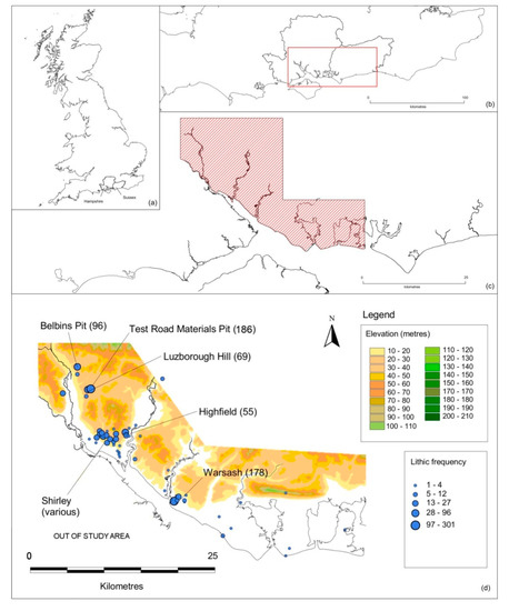 - Hewitt, R.J. The Lower and Middle Palaeolithic Archaeology of the Eastern Solent. Unpublished MLitt Dissertation, University of Newcastle-upon-Tyne, Newcastle-upon-Tyne, UK, 2005. Available online: https://www.researchgate.net/profile/Richard_Hewitt3/publication/325116224_The_Lower_and_Middle_Palaeolithic_Archaeology_of_the_Eastern_Solent_a_map-based_investigation_using_GIS/links/5af8b0d80f7e9b026bec6dde/The-Lower-and-Middle-Palaeolithic-Archaeology-of-the-Eastern-Solent-a-map-based-investigation-using-GIS.pdf (accessed on 18 August 2018).