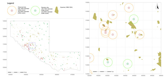 Observed sites, random sites and uncertainty buffers. Inner (100 m diameter) buffers were used in this analysis. The greater the uncertainty, the larger the buffer, and hence, the higher the probability of intersection between sites and quarries.