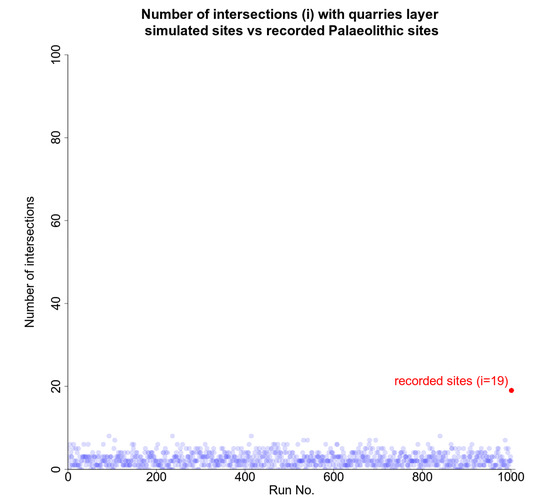 In this sense, the Monte Carlo simulation approach provides a useful way of testing the widely shared assumption that the spatial distribution of Palaeolithic sites of this period in the PASHCC study area (Figure 1) is mostly due to the activities of collectors or fieldworkers in areas of quarrying, without amassing a vast amount of knowledge about the specific context of each site. If we find no association between known locations of quarries that were worked during the period when the artefacts were collected and the recorded locations of the artefacts, we can suspect that the provenance of the finds is less exact than expected, or that the PASHCC collection contains many artefacts recovered by other kinds of excavation than quarrying (river or coastal erosion, subsidence, urban development, etc.). However, if we do find a strong association, we provide good confirmation that, as a whole, the location of the recorded finds is broadly accurate, despite the clear confounding factors noted above.The aim of our investigation was, therefore, to test empirically this widely shared assumption about the spatial distribution of the Palaeolithic sites in the study area, and by doing so, to demonstrate the usefulness of our proposed method.