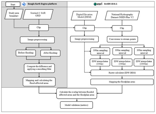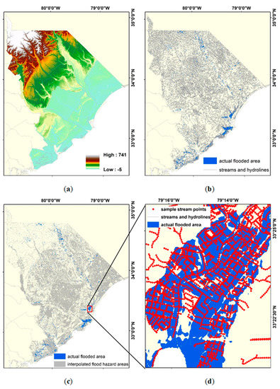 The study employed the inverse distance weighting (IDW) interpolation method in ArcGIS which is a very common and easily implementable tool to predict surface areas in the ArcGIS software. We used high-resolution datasets, such as a LiDAR-based DEM with 3 m × 3 m resolution, and a 1:24000 scale streams and hydrolines, to interpolate and delineate the predicted flood hazard areas. The reliability of the predicted flood hazard areas was compared to the National Flood Hazard Layer of FEMA and US EPA’s floodplain map for CONUS by Woznicki et al. [21].