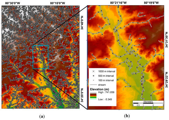 To simulate the process of getting cross-sectional points within streams and rivers as would be done in a 1D hydraulic modeling, the stream hydrolines within the coverage of the study area were extracted from NHDPlusV2 dataset [34]. This include small creeks (first- or second-order streams), arterial streams (third- or fourth-order streams), and main stream centerlines (fifth- and higher order streams). This also includes hydrolines such as altered streams and man-made hydrologic structures, which are typically found in cities and agricultural areas. The streams and hydrolines were then converted using ArcGIS from polyline to points with equal distance intervals in meters (Figure 3a). Three distance intervals (100, 500, and 1000 m) were used in the study to determine the accuracy difference between varying sampling distances (Figure 3b). The study expects that a 100-m interval will provide more information, hence more accurate results, as it will generate more sampling points as compared to a 500- and 1000-m sampling distance intervals. Once the sampling points are obtained from the stream and hydrolines shapefile, the elevation at each point feature was extracted through the “Extract Multi Values to Points” tool in ArcGIS.
