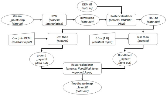 Derivation of the flood hazard areas layer from IDW and DEM was done through ArcGIS version 10.6. The model builder schematics used for the derivation process is shown in Figure 4.