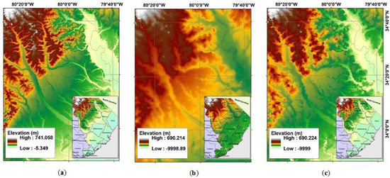 The elevation values for the interpolation method were taken both from a 3 m × 3 m resolution LiDAR-based DEM obtained from SCDNR [33] and a 30 m × 30 m resolution DEM from the National Elevation Dataset (NED) [35]. The DEMs were preprocessed through the “Fill” tool to smoothen drainage direction and irregular elevation information. This gives a consistent topographic analysis for the model as it minimizes the occurrence of sudden “dips” and “peaks” in the landscape caused by irregularities in the data. This also improves the prediction estimates of the model since the interpolation method conforms to a nearest neighborhood estimation principle. A similar procedure was applied to both DEMs to compare the performance of a LiDAR-based DEM (3 m × 3 m resolution) with a satellite-based DEM (30 m × 30 m resolution).