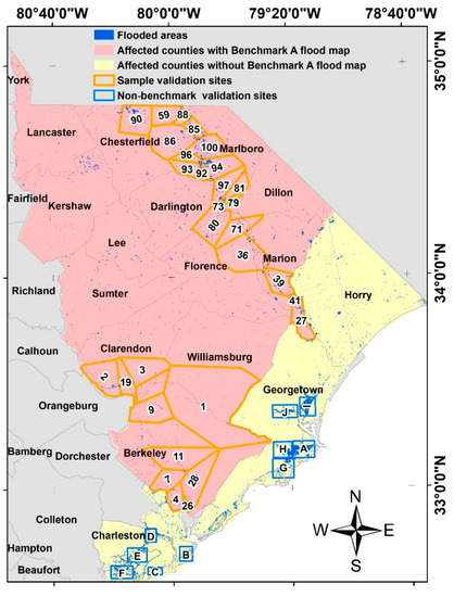 To select the sites to be sampled for validating the predicting capability of the delineation method, we generated 100 random points across the flooded areas. We used the points as centroid to generate a Thiessen polygon in the ArcGIS software (Figure 6). The Thiessen polygons created irregularly shaped but adjacent polygons across the coverage of the flooded areas. These were treated as random selection boundaries to eliminate the geographical biases of the sampling points such as administrative boundaries and territories. Furthermore, we randomly selected 30 of the Thiessen polygons as representative sample sites for validation. The actual flooded area and the predicted flood hazard area from the different interpolation configuration were computed in each sample site. The computed areas were used for computing the respective metrics applicable to each configuration. Furthermore, 10 specific sites in the coastal areas, which were severely impacted by the hurricane, denoted in this paper as sites A–J, were selected to apply the interpolation method. The metrics were also measured for each configuration and in each of the specific sites. However, since the coastal areas for South Carolina do not have FEMA flood zone maps, the metric comparison for these 10 sites was not conducted for Benchmark A but rather only for Benchmark B.