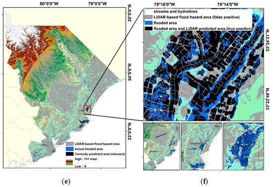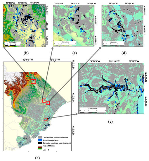 Raster output of flood hazard area analysis: (a) shows specific sites locally selected from severely affected areas across the state; (b) results from Chesterfield, Marlboro, and Darlington counties; (c) results from Marion county, (d) results from Marion and Horry county; and (e) results from Georgetown county.
