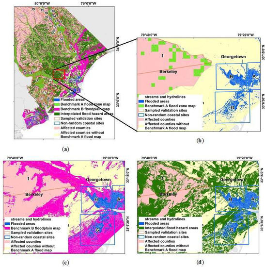 Spatial distribution of benchmarks and interpolated flood hazard areas: (a) shows an overlay comparison of benchmark floodplains and flood hazard areas vis-à-vis the different model predicted flood hazard areas, (b) shows an overlay comparison of benchmark A flood hazard zones vis-à-vis the actual flooded areas, (c) shows an overlay comparison of benchmark B floodplain map vis-à-vis the actual flooded areas, and (d) shows an overlay of the model predicted flood hazard areas vis-à-vis the actual flooded areas.