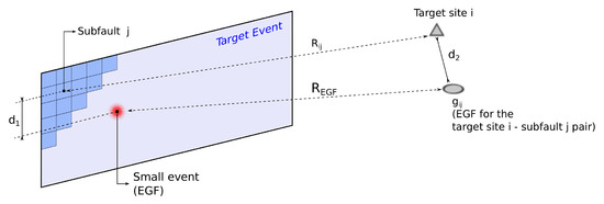 Schematic representation of EGF event selection. Of all the historical records available in the vicinity of target site i from earthquakes on the target fault located in the vicinity of subfault j, the record best represents the path between target site i and subfault j [21].