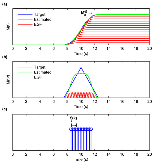 Time shifts used in previous studies. (a) moment (or slip) vs. time and approximation using multiple EGFs. (b) Moment-rate (or slip rate) vs. time and approximation using multiple EGFs. (c) Subfault j time shifts used in the EGF summation.