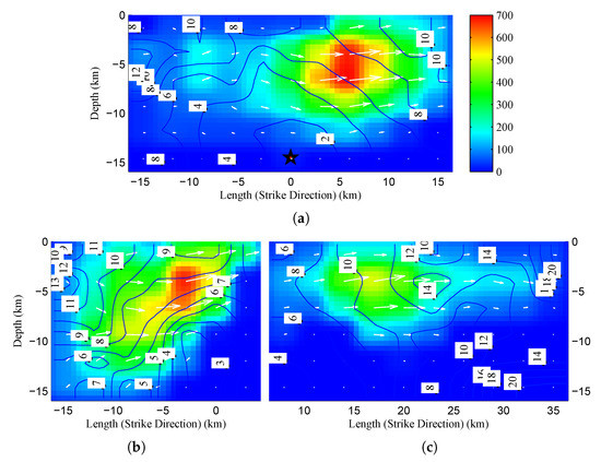 Fault segments of [49,50] source model for the 1999 7.1 Hector Mine earthquake, resampled to a subfault dimension of km. Color map: Slip distributions in centimeters. Arrows: Slip direction. Counters: Rupture times in seconds. Star: Hypocenter of the event. (a) Fault Segment 1, (b) Fault Segment 2, and (c) Fault Segment 3.