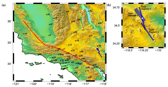 (a) Location of all stations used in the 1999 Hector Mine earthquake validation. Red line: Southern section of the San Andreas fault extending from Parkfield in central California to Bombay Beach in southern California. Blue line: Surface projection of the [49,50] source model. Star: Epicenter. Black triangles: Stations (b) Fault segments in the model. Blue line: Surface projections. Black line: Surface trace. Star: Epicenter.