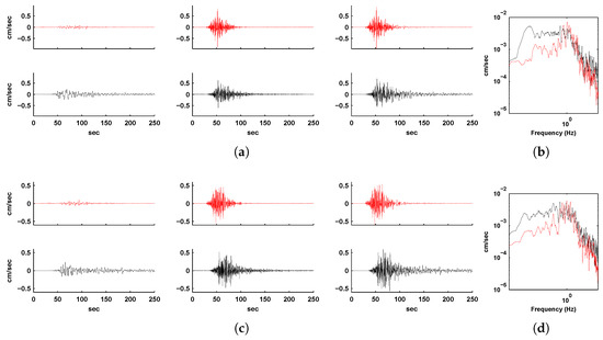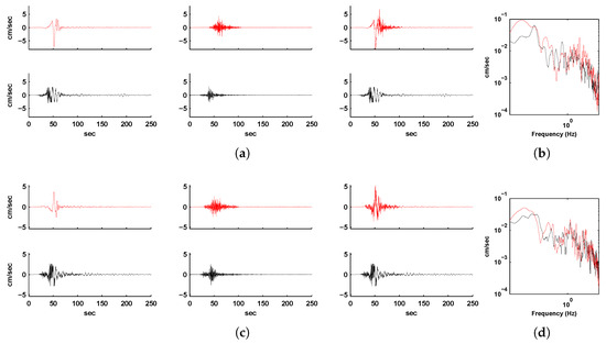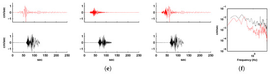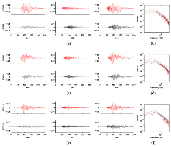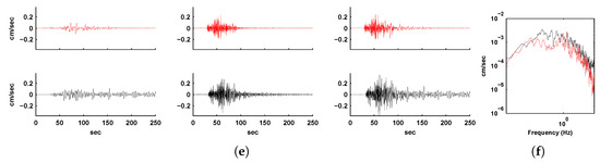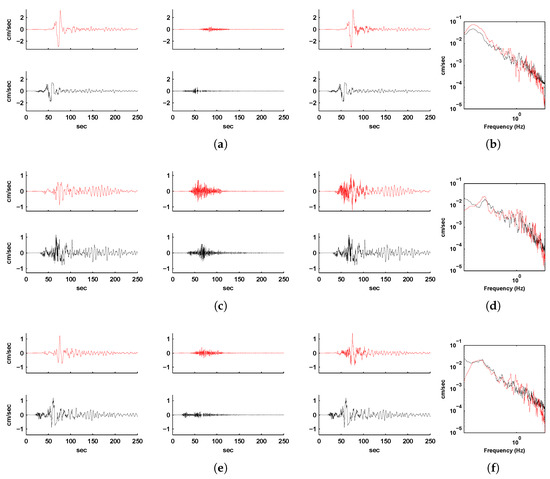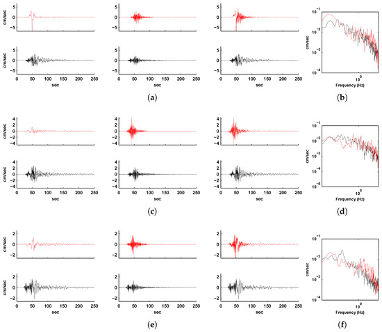 Figure 14a,c,e illustrate the north-south, east-west and vertical components of the synthesized and the recorded ground velocities at Station 1 (see Figure 12 for Station location). The first column (on the left) of each of the figures corresponds to low-frequency (<0.5 Hz) velocity waveforms generated using the spectral-element approach, the second column (middle) corresponds to high-frequency (0.5–5 Hz) velocity waveform the EGF approach, and the third column illustrates the broadband ground motion waveforms (<5 Hz), synthesized by superimposing the two. Figure 14b,d,f compare the corresponding velocity spectra of these components of simulated and recorded ground motion. Figure 15a–f and Figure 16a–f show similar comparisons for stations 10 and 40, respectively.