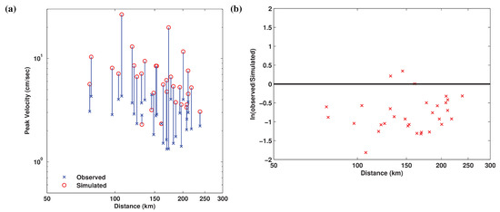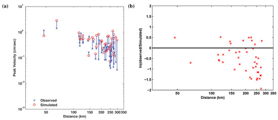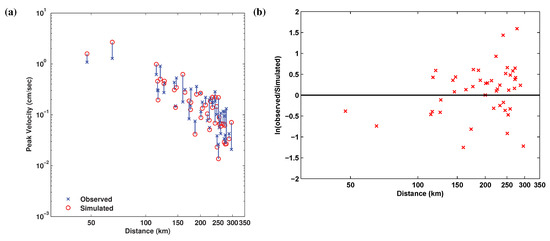 (a) Comparisons of peak ground velocity (PGV) of the simulated and the recorded broadband ground motions as a function of station distance to the hypocenter of the 1999 Hector Mine earthquake. (b) Natural log of the residual of simulated and recorded values.