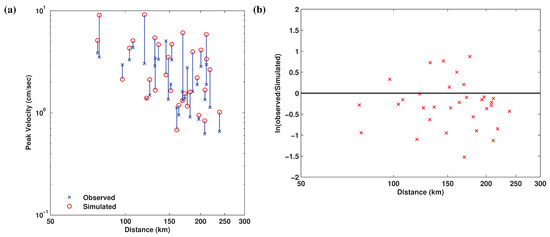 (a) Comparisons of peak ground velocity (PGV) of the high-frequency content of the simulated and the recorded ground motions as a function of station distance to the hypocenter of the 1999 Hector Mine earthquake. (b) Natural log of the residual of simulated and recorded values.