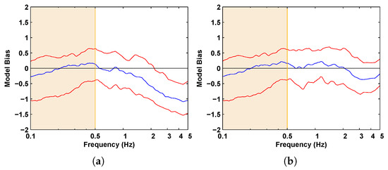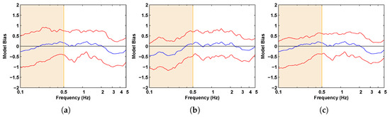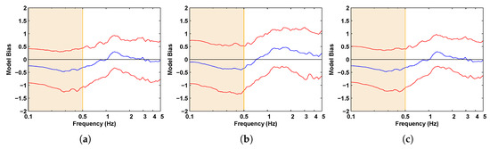 Bias in the synthetic associated with -damped acceleration response spectra at 32 stations relative to the corresponding spectra of recorded ground motion during the 1999 Hector Mine earthquake. Blue line: Bias. Red line: Standard error. (a) North component, (b) East component, and (c) Geometric mean horizontal component.