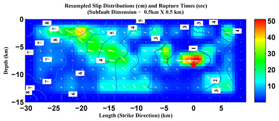 Resampled kinematic source model for the 2004 6.0 Parkfield earthquake by [51]. Subfault dimension km × km. Color map: Slip distribution in centimeters. Arrows: Slip direction. Counters: Rupture times in seconds. Star: Hypocenter of the event.