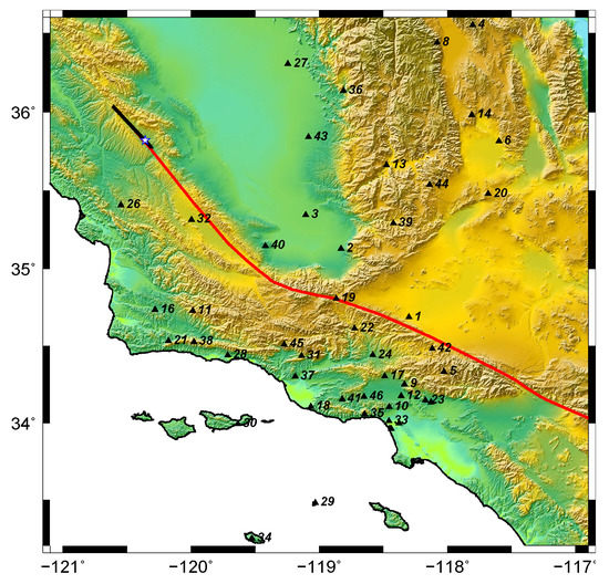 Location of all stations used in the 2004 Parkfield earthquake validation. Red line: Southern section of the San Andreas fault extending from Parkfield in central California to Bombay Beach in southern California. Black line: Trace/surface projection of the [51] earthquake source model. Star: Epicenter. Black triangles: Stations.