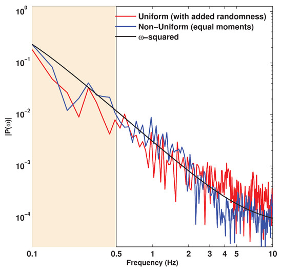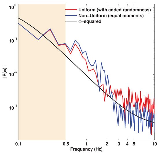 Now, the theoretical transfer function of Equation (14) can be compared to the empirical transfer function of Equation (12). The empirical transfer function is evaluated for two different choices of : (1) assuming a non-uniform distribution (equal moments) of events within the subfault’s rise-time as in this study (Equation (2)) (2) assuming a uniform distribution of events within the subfault’s rise-time (Figure 2), with an added randomness. This is implemented using a gaussian distribution for each with a mean at and standard deviation equal to / ( confidence interval).