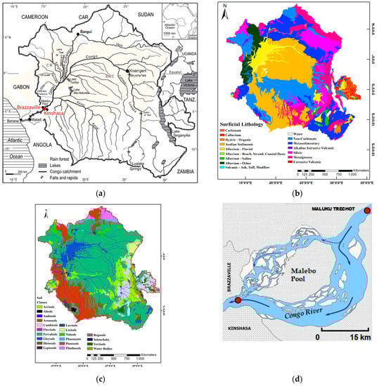 Introduction to the study site: (a) Overview of the Congo River Basin (adapted from Runge, 2007 []), (b) geology, (c) soil, and (d) Malebo Pool; the 2 dots represent the sampling station of the PEGI/GBF program in the upper part, and the sampling station of the SO/HYBAM program in the lower part.
