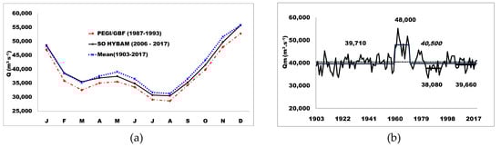 The evolution of the monthly discharge between the two studied periods is quite similar (Figure 3a). The two curves are quite parallel, with a slight increase of 4% for the recent period. The interannual average is 38,080 m3 s−1 and 39,660 m3 s−1 respectively for PEGI/GBF period and SOH period (Figure 3b), with a similar standard deviation (Table 1). The PEGI/GBF period belong to the driest interannual hydroclimatic period.
