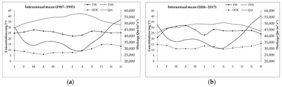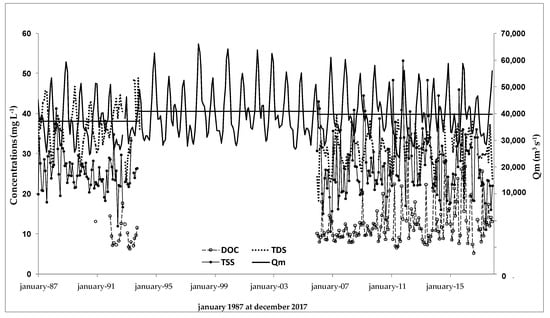 Monthly TSS concentrations are linked to the monthly discharge, with two small peaks during the year, one in March, just before the first rise in water of the Congo River, and a second in August–September, just at the beginning of the main water rise of the Congo River (Figure 5). However, TDS and DOC concentrations do not follow this pattern. During the earlier studied period (1987–1993), the monthly TDS concentrations described a one-peak curve along the year: the peak of TDS load is in August (with 42.2 mg L−1) during the base flow period. The monthly DOC curve follows a delay, describing also a one-peak curve with the maximum in November (with 34.1 mg L−1), just one month before the discharge peak flow (Figure 5).